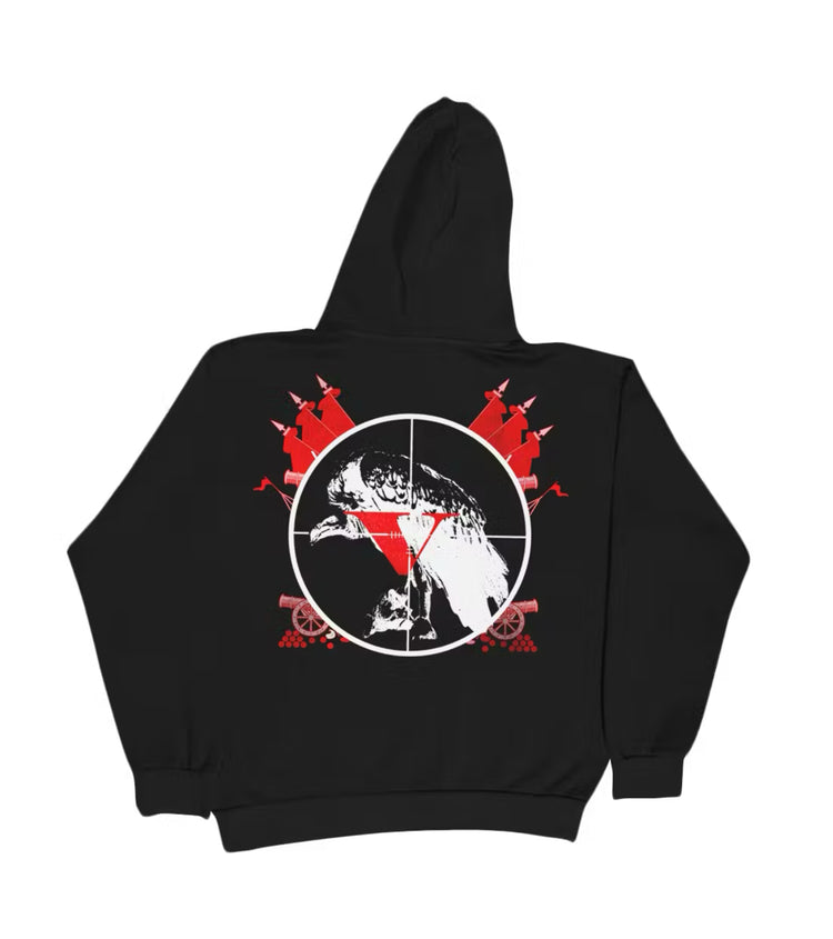 This Kodak Black x Vlone AK Hoodie merges street culture and raw symbolism into one bold piece. The front features a striking “Vlone x Kodak” logo stylized around an AK silhouette in red and blue — a nod to Kodak’s Haitian roots and rebel energy. On the back, a powerful vulture graphic sits in the crosshairs, surrounded by cannons and castle flags, creating a gritty warzone aesthetic that screams survival and statement.