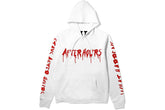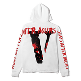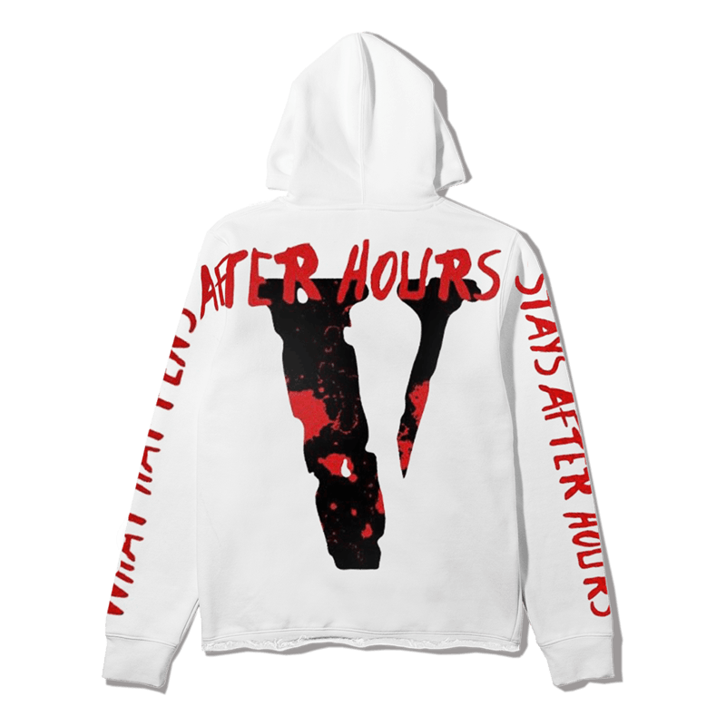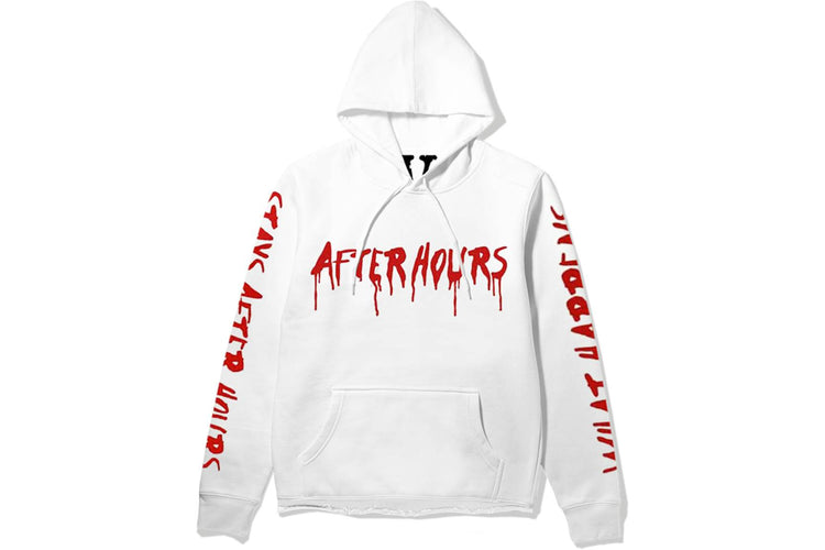 The Weeknd released a collaborative merchandise capsule with Vlone for his 2020 album, After Hours. This white hoodie from the capsule features the name of the album in a red dripping font on the front and a black blood-spattered Vlone logo on the back. From sleeve to sleeve, the phrase "WHAT HAPPENS AFTER HOURS STAYS AFTER HOURS", can be read in a red font. This The Weeknd merch hoodie released on March 20th, 2020, the same day his album released.