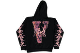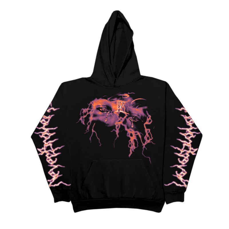 The Vlone x Never Broke Again Eyes Hoodie Black is a hooded sweatshirt with a graphic that spans the entire arm surface with a contrasting cord.