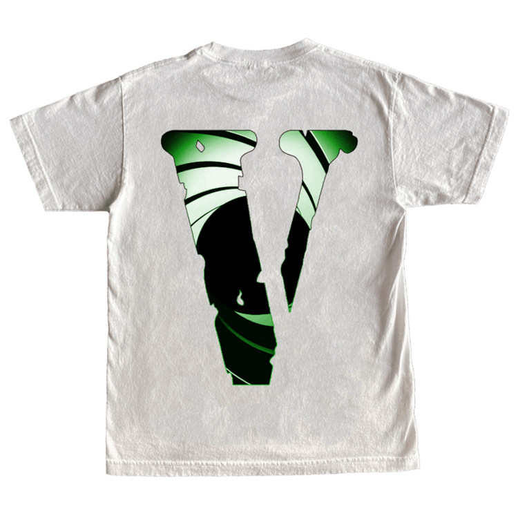 On the front of this Juice Wrld x XO x Vlone T-shirt is a neon green and black graphic that says the word "Smile." On the back of the Juice Wrld x XO t-shirt is a large Vlone logo with a green and black spiral inside of it.